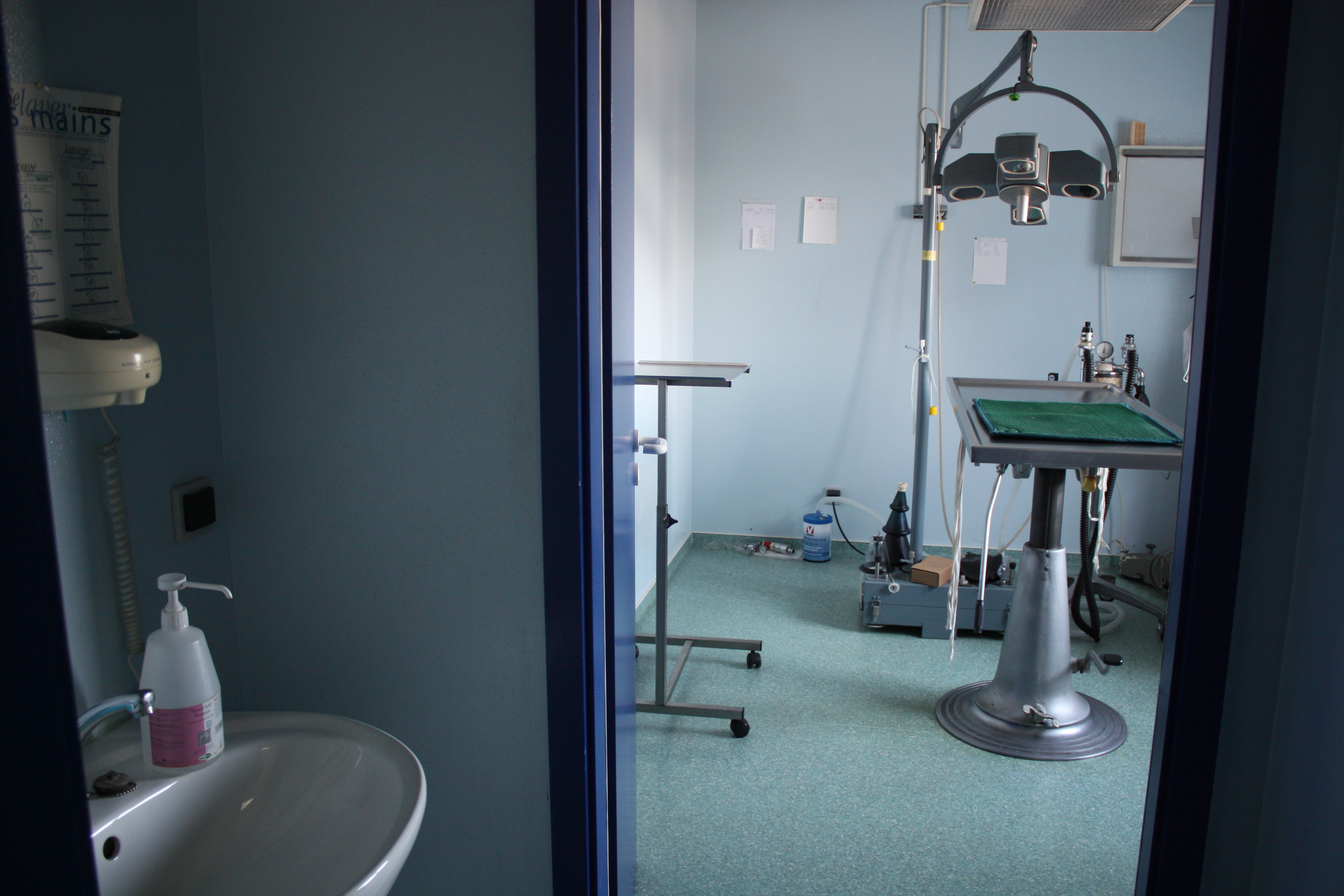Un sas de désinfection sépare la salle de préparation de la salle de chirurgie. Les chirurgiens et le personnel opérant s’y désinfectent longuement les mains avant de revêtir les habits de chirurgie et les gants stériles. Nous attachons une importance particulière à cette désinfection de sorte que la plupart des chirurgies courantes simples ne nécessitent pas la prise d’antibiotiques.
